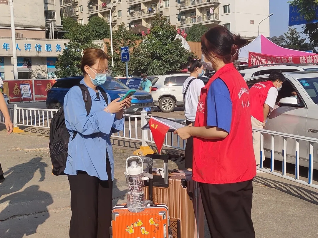 志愿者们在校门口检查核酸报告绿码和通知书并进行测温