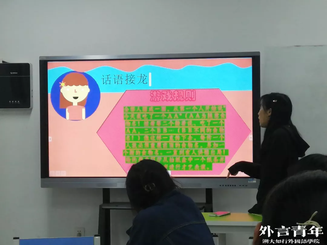 影片观看结束后,随即迎来的是大家期待已久的话语接龙。游戏规则是全部人围成一圈,从第一个人开始说"今天我吃了一个AA"(AA为随意食物名!接着第二个接着说,吃了一个AA,二个BB…(BB不同的食物名!)像这样一直传下去,每传一个人就必须重覆前面的食物名,另加一个新的食物名。一直到有人讲错出局!此项游戏考验大家的记忆能力和反应能力,尽管有些同学不太熟悉规则,但游戏还是顺利地通过了。