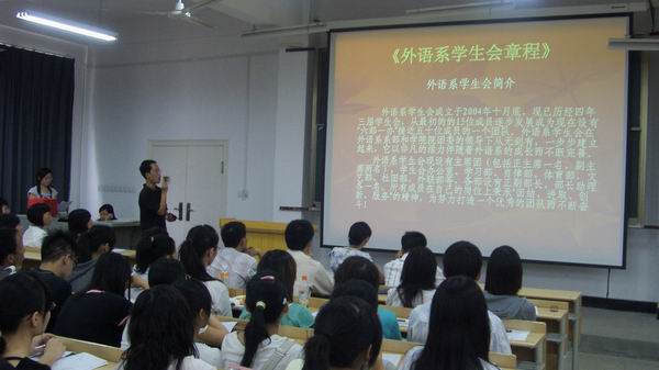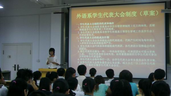 很早以前,外语系分团委学生会组织就在酝酿召开外语系自己的学生代表大会,由于种种原因没有予以实施。值此外语系2008年招生工作取得优异成绩,全系学生人数达到710余人之际,我们迫切感受到外语系学生代表大会召开的必要性。因此,在系领导的指示下,在学生会指导老师林名仲老师的带领下,学生会的主要干部在暑假期间就主动放弃了自己的休息时间,紧锣密鼓地开始筹备外语系第一届学生代表大会。在暑假期间,我们完成了《对召开学生代表大会的筹备策划书》,策划书中详细的介绍了整个学代会的筹备方案及流程,对学代会筹备工作向学生会各个部门予以分工并完成了会议所需要的大部分文件起草工作:包括《外语系第三届学生会工作报告》、《外语系学生会章程》、《外语系学生代表大会制度(草案)》、《外语系学生代表大会倡议书》等。至此学代会的筹划工作基本结束。