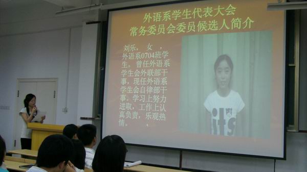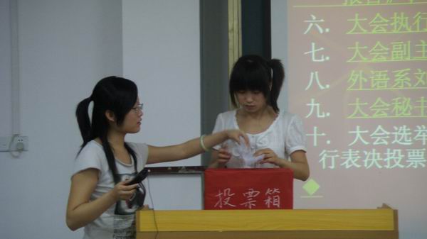 10月7日、8日晚上,大会继续进行。会上进行了外语系第四届学生会的竞聘演讲,代表们认真听取各竞聘人员的演讲,并投出了自己庄严的一票。会后,大会筹委会对大会常务委员会的候选人,第四届学生会竞聘演讲进行了计票统计工作。