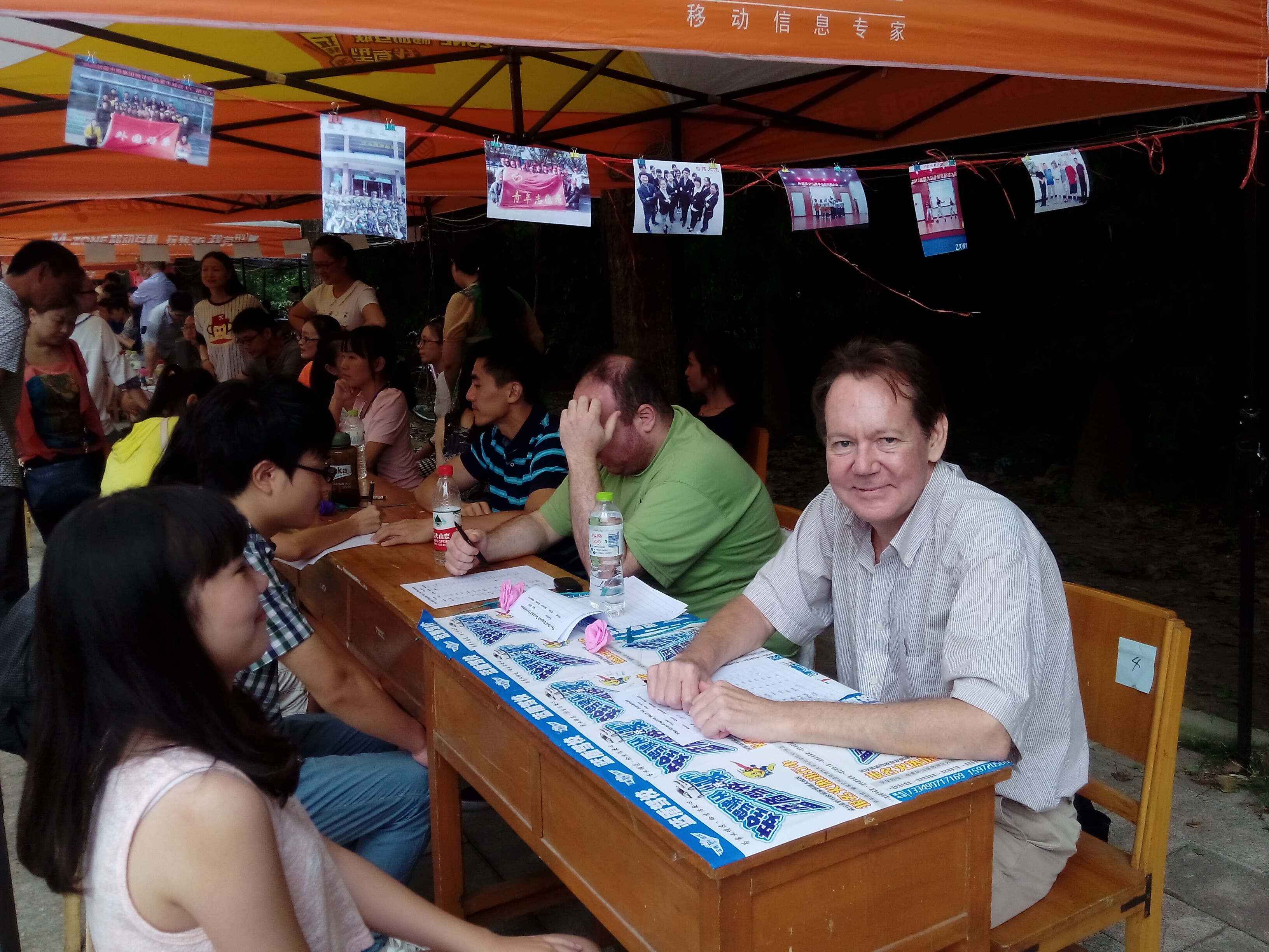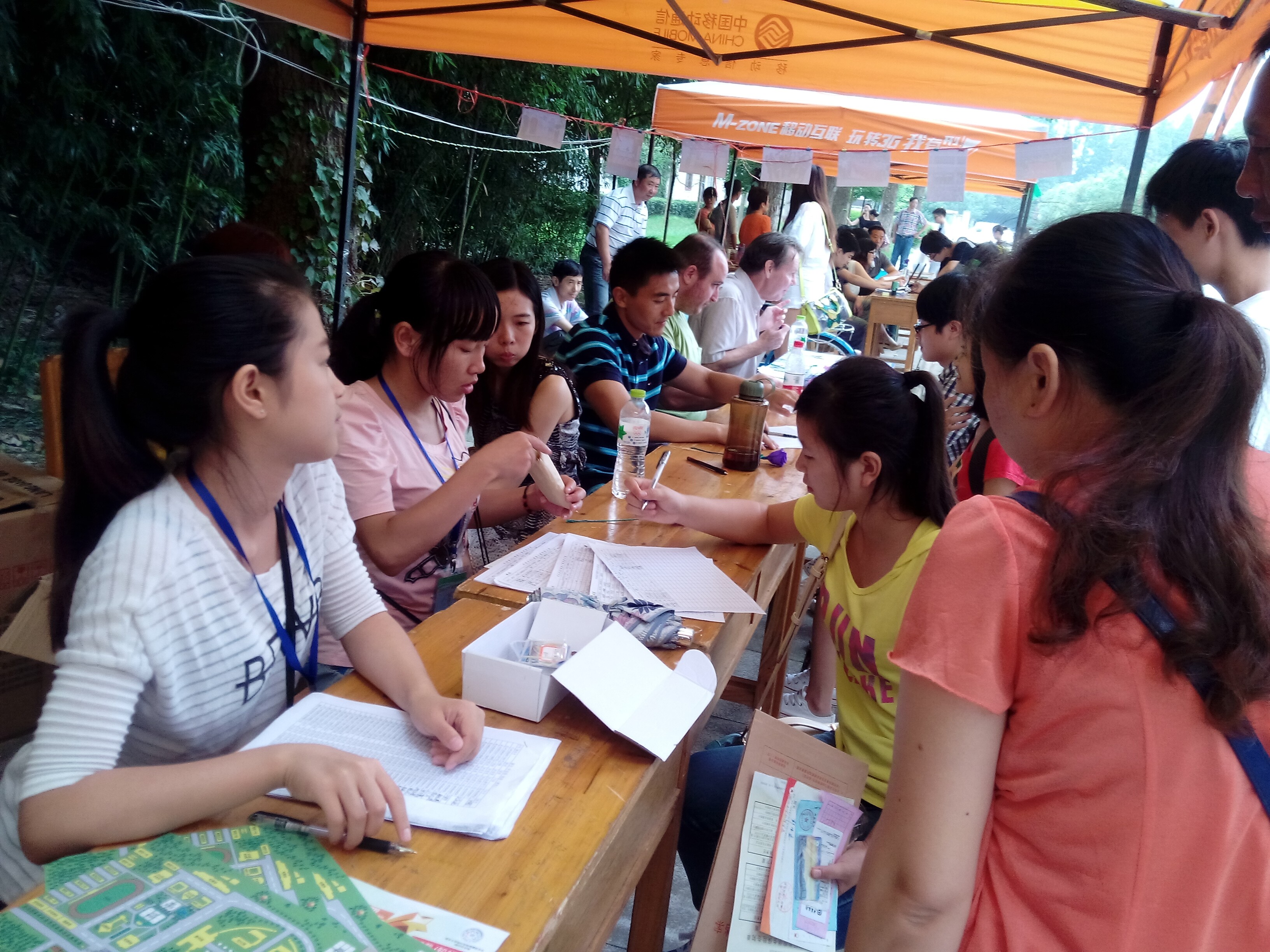 本次迎新接待点在图书馆后门,新生报到之后,新生辅导员热情接待,为其登记信息,收取资料。登记完毕后,三位外教为每一位新生做了简短的口语测试,然后志愿者带领新生领军训服装,引导入住宿舍,并介绍在学校生活学习需注意的事项,提醒同学们在军训期间认真训练,尽快熟悉并适应学校的生活。
