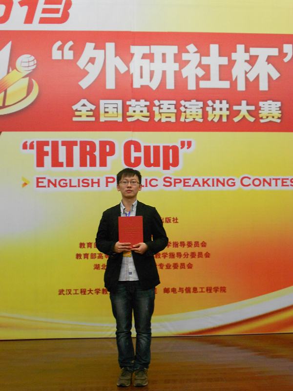 本网讯 (通讯员林名仲)11月9日上午,2013年“外研社杯”全国英语演讲大赛湖北赛区复赛在武汉工程大学隆重举行,全省四十余所高校派出选手上演了一场英语演讲的视听盛宴。我院口译队夏澍雨同学凭借稳定出色的发挥力压省内众多一本高校,夺得一等奖,创造了我院在该项赛事上的最好成绩。在赛后点评中,专家特别赞赏了夏澍雨同学在即兴演讲中对《傲慢与偏见》经典原文的引用,“体现了学生较为充分的习得了西方语言文化,展现了扎实的英语语言功底”。