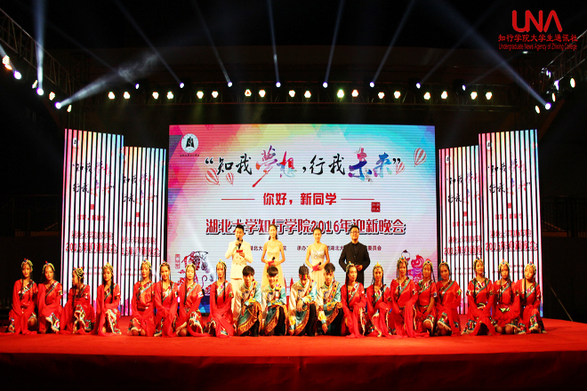 本网讯 9月22日晚,湖北大学知行学院田径运动场灯光璀璨,歌舞飞扬,“知我梦想 行我未来” 2016级迎新晚会在这里隆重举行。中国人民解放军九五二二七部队长范晖煜中校、学院党委书记吴志文、院长彭徳忠、党委副书记高志宏、副院长钟春敏、陈刚、黄智凌、党委委员刘张虎、新建中环集团董事长、新建村党支部书记胡国红、全体军训教官、学院各部门负责人、教职工代表以及2900多名新生和在校生一起观看了演出。