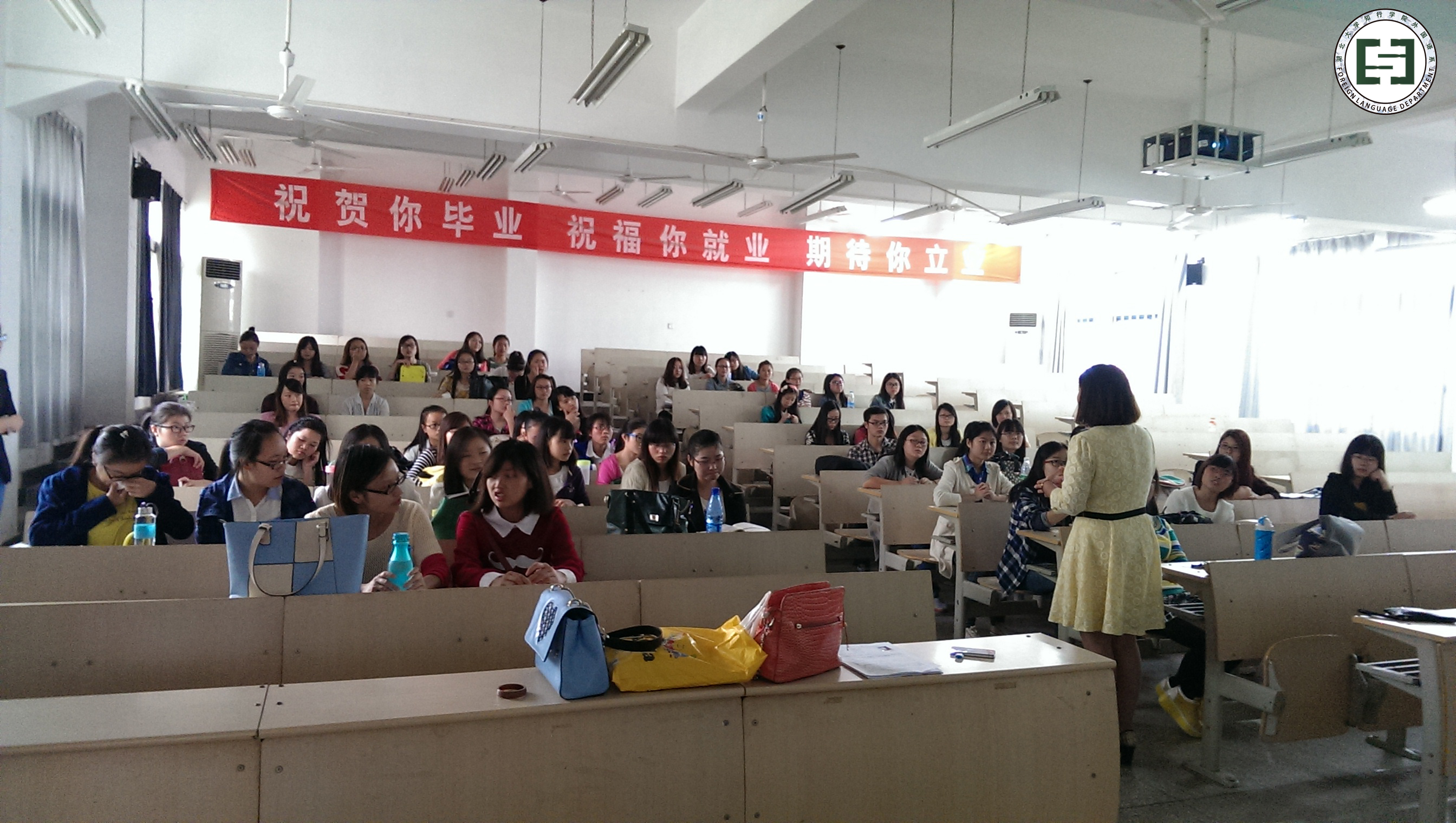 【本网讯 彭琪】2014年10月15日外国语系专场招聘会于4教108隆重举行,外国语系刘克书记和毕业班辅导员出席了。会上,刘书记热心的鼓励2011级同学们要做到不妄自菲薄、不好高远,积极求职。