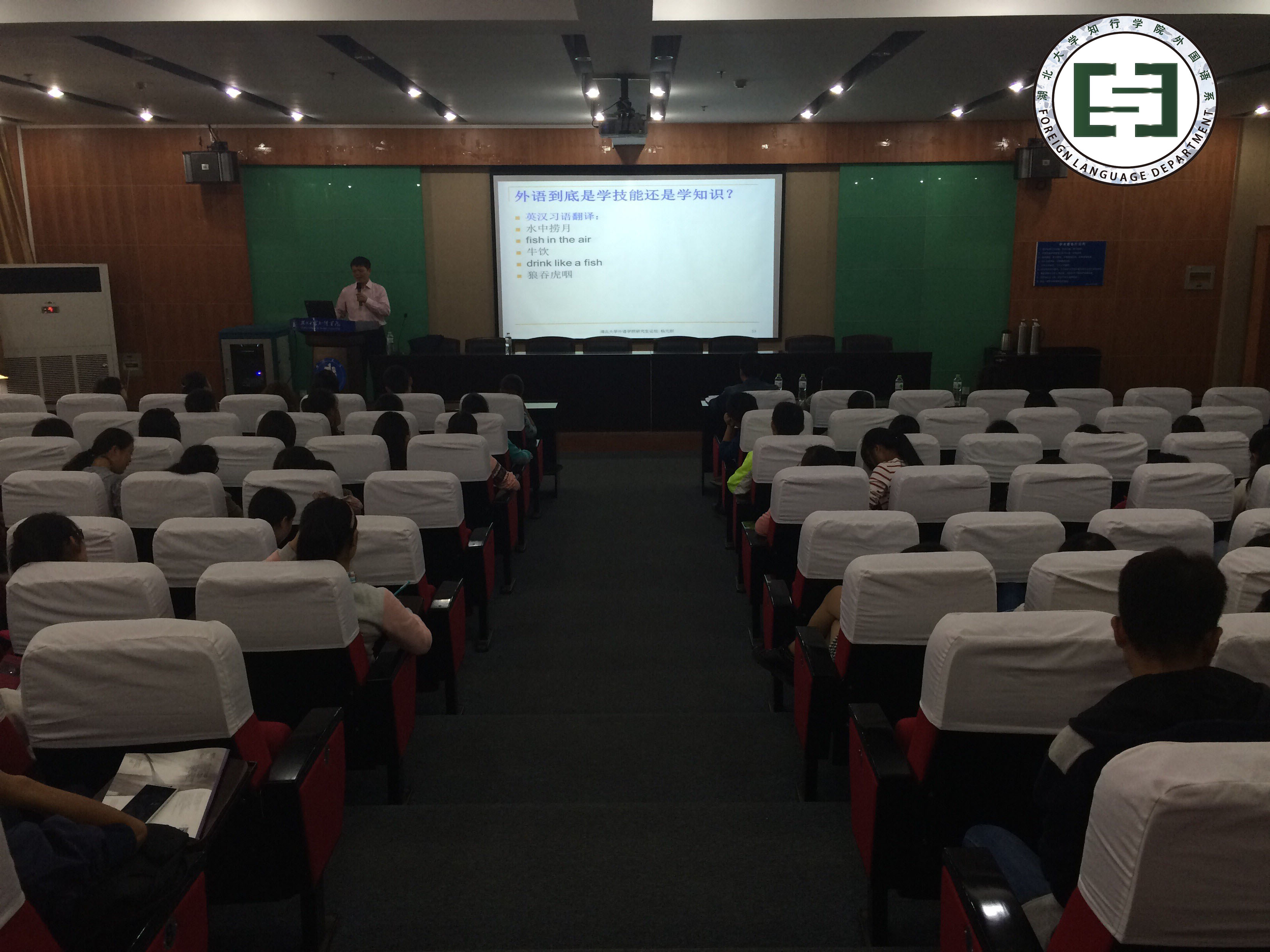 本网讯(通讯员 汤飘)10月22日下午,武汉市翻译协会常务副会长、湖北大学外国语学院副院长杨元刚教授应邀莅临我院,在行政楼学术报告厅202做了主题为“大学生外语学习观念谈”的讲座。湖北大学知行学院副院长钟春敏,外国语系主任冯健、书记刘克、副书记傅丽及全体辅导员出席了本次讲座。