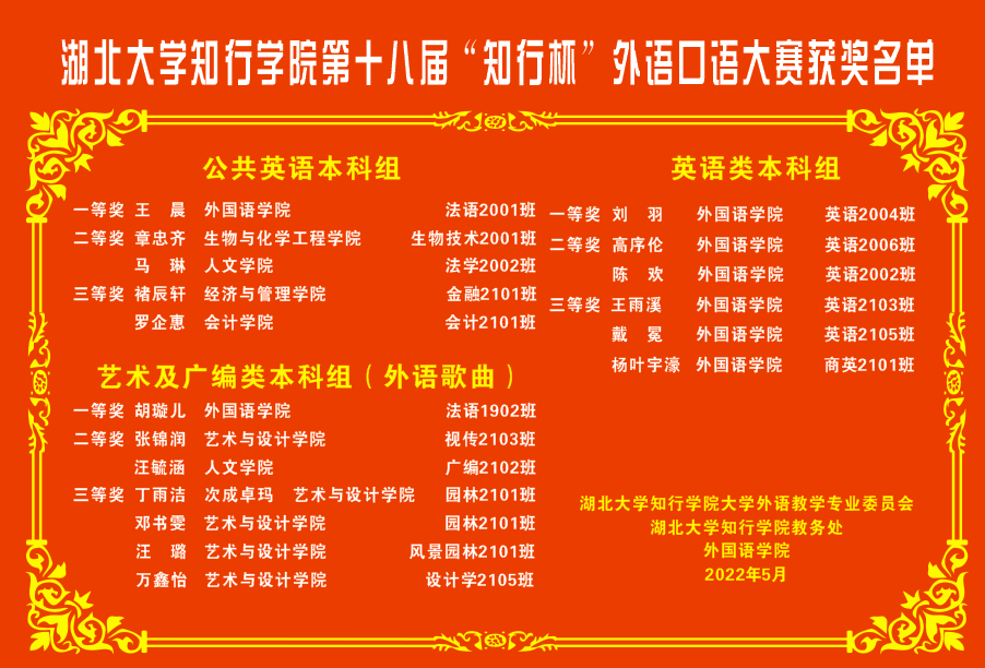 湖北大学知行学院第十八届知行杯外语口语大赛获奖名单