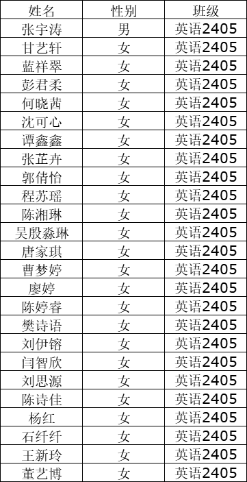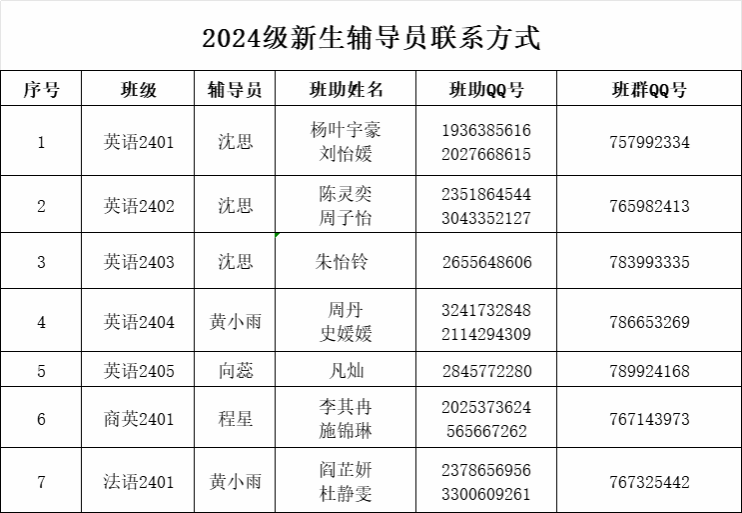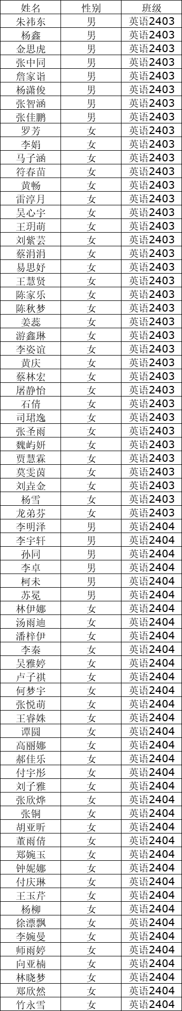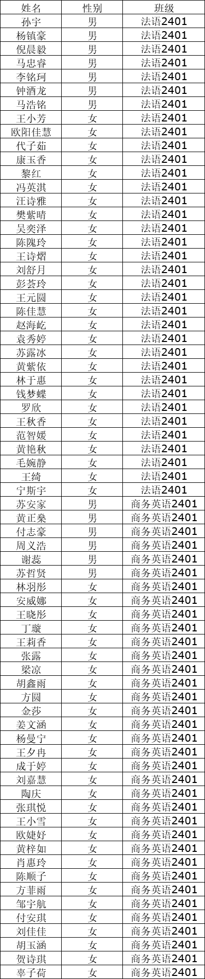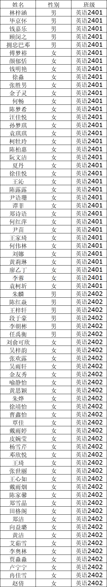 全体2024级新生:学院现根据学校招就处录取专业及英语专业分方向(含实验班)意愿征求,现公布2024级外国语学院各专业分班名单,外国语学院2024级共分为7个专业班级:法语2401本 、商务英语2401本 、英语2401本(含翻译和教育方向)、 英语2402本(教育方向)、英语2403本(教育方向)、英语2404本 (教育方向)、英语2405本(综合实验班)。