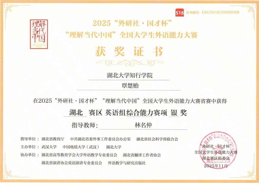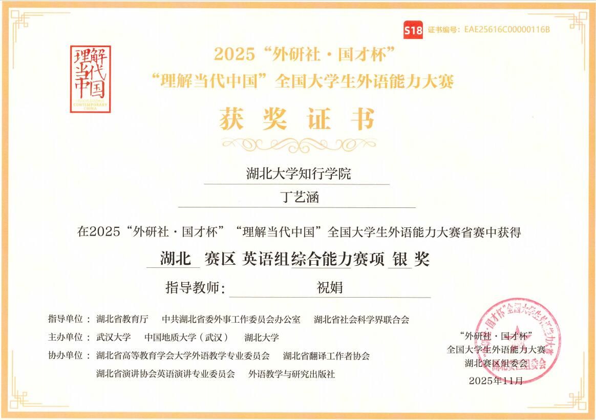 近日,2025年“外研社·国才杯”“理解当代中国”全国大学生外语能力大赛(湖北赛区)圆满落幕。在这一聚焦青年外语能力与思想素养的顶级赛事中,我校学子凭借扎实的语言功底和深厚的家国情怀,在激烈的角逐中脱颖而出,最终斩获2项银奖、6项铜奖及15项优胜奖。值得一提的是,本次比赛我校在多语种组与“讲好中国故事”短视频赛道均赢得历史性突破,充分展现了学校在外语人才培养模式创新上的显著成效。