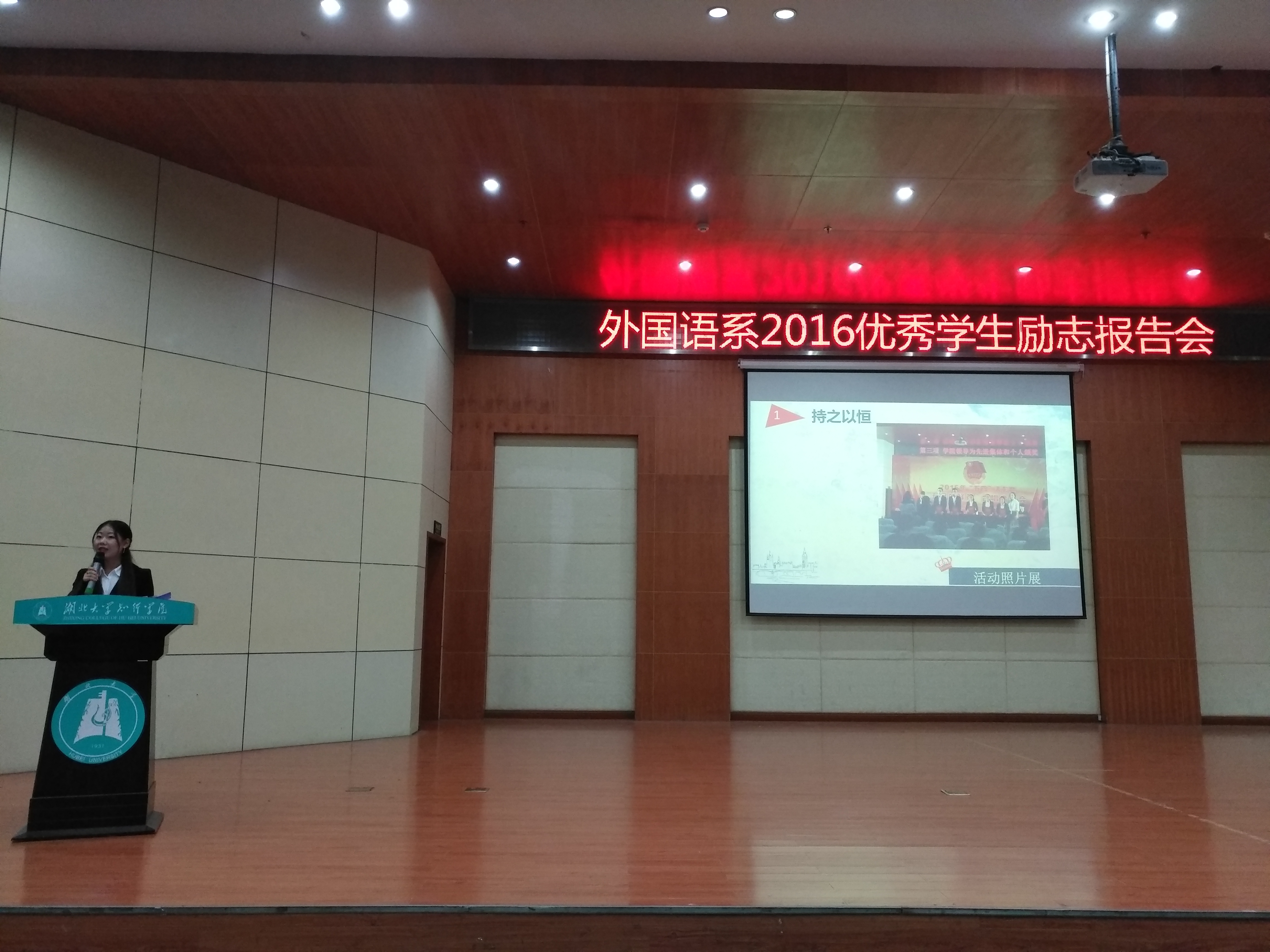 1305班雷娟、1402班赵晶晶、1302班罗蒙、1505班高洁、1402班俞诗婷、1401班黄锦在本次报告会上进行演讲。雷娟在演讲中围绕“不忘初心,继续前进”,从一个身份、二点感悟、三个建议向在座学子讲述自己的大学生活。“学习达人”赵晶晶从学习方法讲起,又将预习、听课、复习三点细化讲解。并提供了一些专四的备考方法。罗蒙则从工作和学习两方面讲,告诉大一学子要全面发展。而高洁通过自己的事迹告诉大家要不断进步,让优秀成为一种习惯。院学生会副主席俞诗婷根据自身工作经验提出许多需要注意的工作小细节,寄语大一学子们都能成为一名优秀学生干部。系学生会主席黄锦讲了梦想,告诉大家要敢梦、敢闯,这样才能实现自己的梦想。
