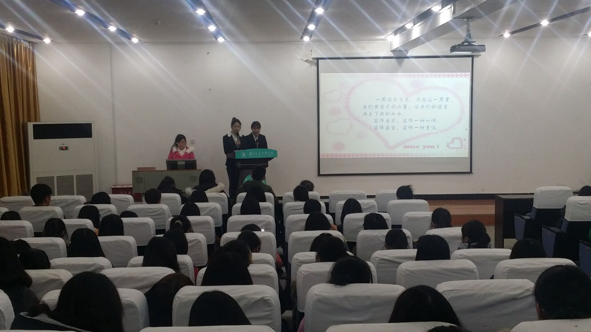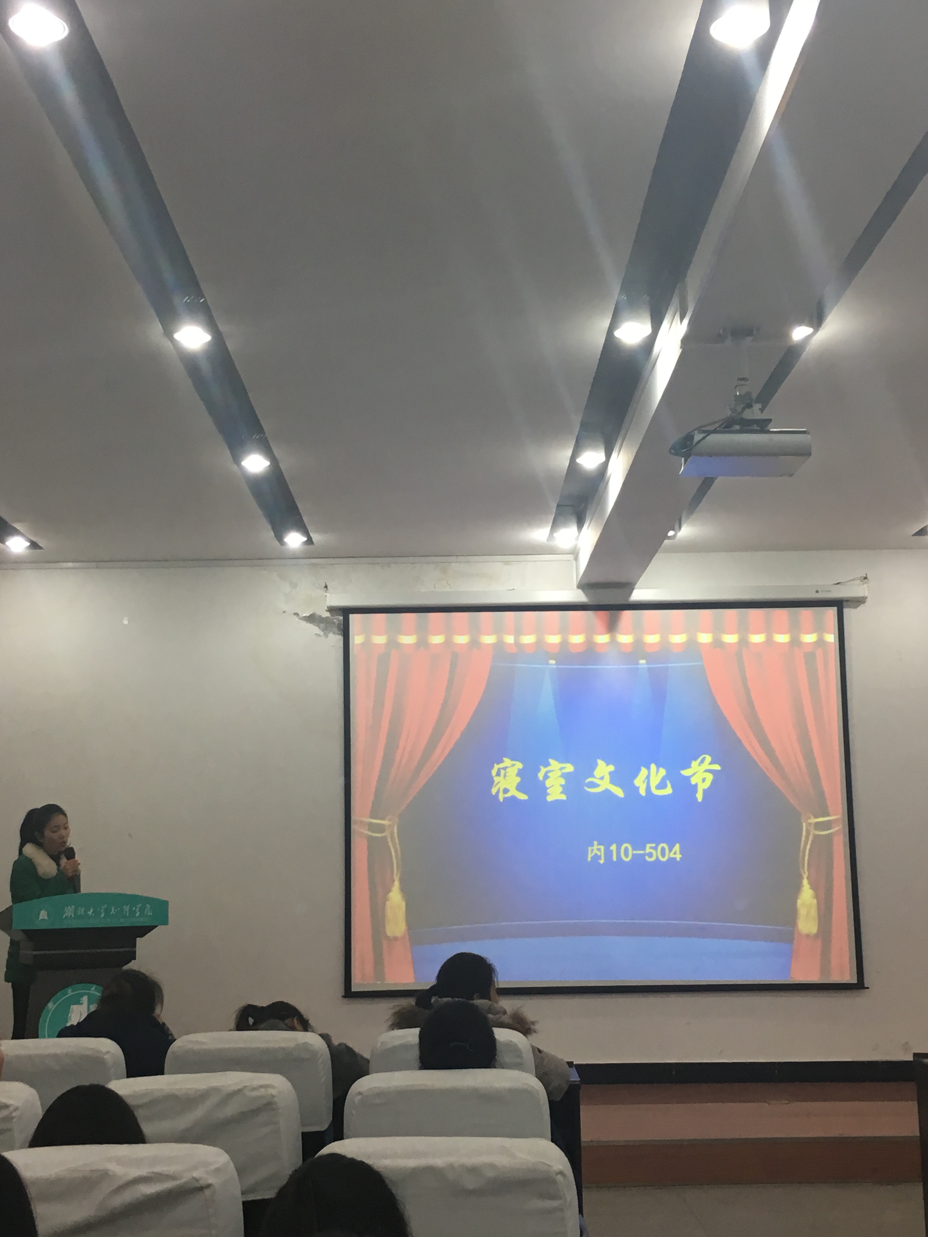 本次活动从播放优秀寝室剪影合集开始,为各位老师和同学展现了各个寝室的风采。随后,优秀寝室代表上台通过PPT的形式展视自己的寝室装扮并介绍每一位成员。每个寝室都有属于自己寝室的不同主题。有蜗居的雅士、追风筝的女孩、暖暖、童真小屋、木婉清、狼人基地、dream等。通过这些,他们为老师们与同学们讲起了每一位成员,每一张照片,每一个故事。从中展现出每个寝室浓浓的爱。最后活动在冯书祥老师的结语中落下帷幕。