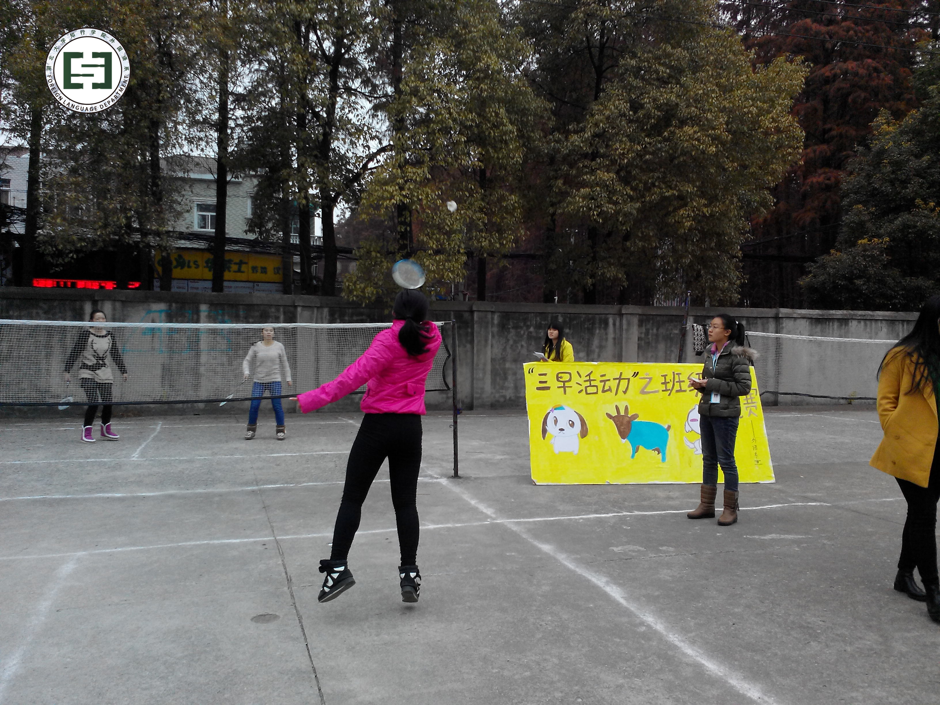 本网讯 (通讯员:张萌)2014年12月11日,由外国语分团委学生会举办的“三早”活动之大一、大二班级对抗赛如期在知趣楼旁的训练场上隆重举行。