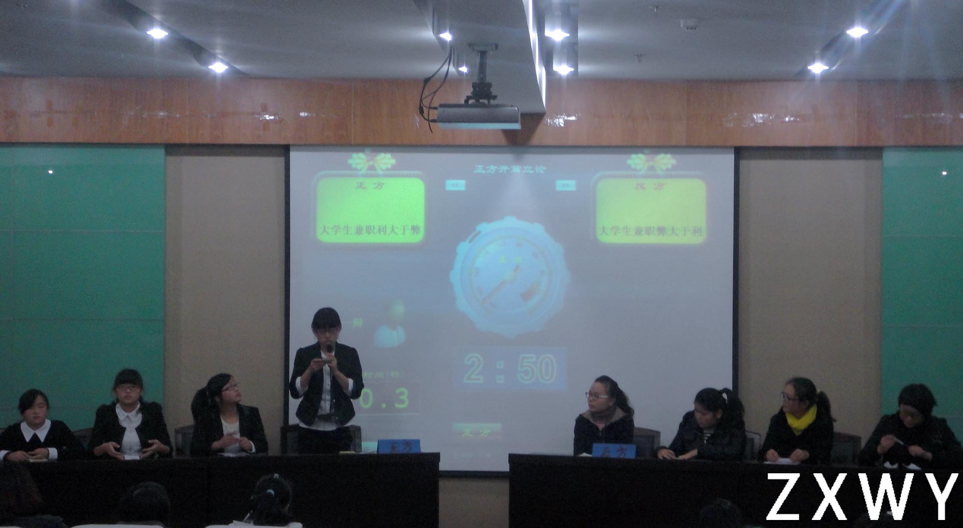 此次辩论赛分有两个辩题,“压力是否有利于学习”和“大学生兼职利大于弊”。在第一轮辩论环节中,正方与反方就压力与动力的关系进行了激烈的争论,正方认为压力等同于动力,压力可以促使我们更好的学习。反方则认为直接把压力等同于动力太过片面,压力会引发学生的一系列的身体与心理健康问题,不利于学生的长远发展。在辩论“大学生兼职利大于弊”中,反方结合自身实例,谈到学生兼职所面临的风险,认为学生主要任务应该是学习,兼职则会占用过多课余时间。而反方谈到,诚然学生兼职会遇到很多问题,但我们可以从中获得社会经验,从而更好的适应社会。辩手们结合历史典故,社会调查和自身实例多方面论证自己的辩题,赢得场下掌声连连,赞扬不断。