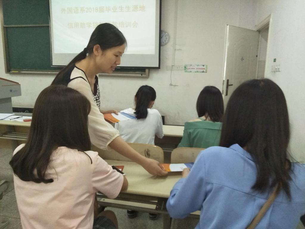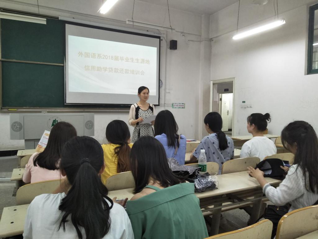 6月14日中午12:30,外国语系于4-102教室召开“2018届毕业生生源地信用助学贷款还款培训会”,我系全体2018届生源地信用助学贷款毕业学生参加。