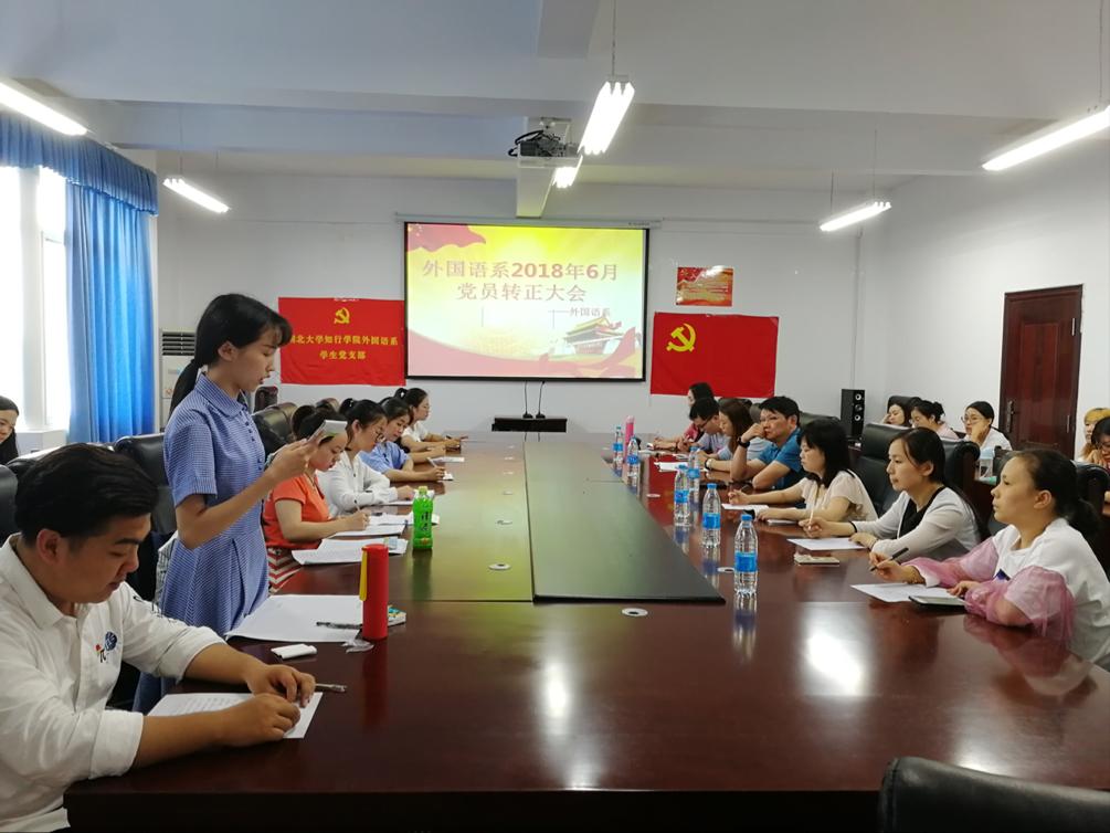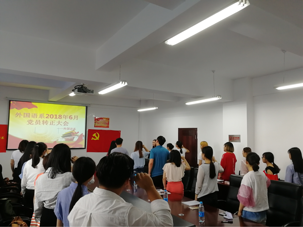 6月13日中午,外国语系在行政楼601举办了2018年6月党员转正大会,八名预备党员同志宣读转正申请,他们分别从思想上、生活上、学习上、工作上四个方面对自己预备党员一年的党组织生活进行了总结,在他们的申请中,可以看出他们对于过往的肯定和反思,对于未来的小杨展望,特别是毕业生党员,她们讲述了自己在实习期和准备考研过程中的一些心得,更肯定了作为一名党员保持先进模范作用的重要性。会议中,陈启金书记分别从党员同志该做什么、不该做什么,党员同志今后的发展应该提高哪些能力,对外国语系所有党员的要求这三个方面表达了自己对于党员同志的期望,并祝贺八名同志转正成功。会议最后,全体党员同志重温入党誓词,声音嘹亮表达了作为一名优秀党员的决心。(程星 岑胜兰)